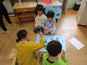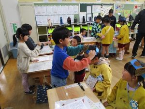 生活科の学習をいかして、秋の自然をテーマにした「あきまつり」を開催しました。どんぐりや葉っぱなど、秋の素材を使って、子どもたちが工夫を凝らした屋台が並びました。ジャンケンゲームでどんぐりのネックレスをもらったり、葉っぱに絵を描いて王冠にしたり、どんぐり釣りやコマ回し、まつぼっくりのけん玉、どんぐり迷路など、楽しい遊びが盛りだくさん!今回は、幼稚園のひまわり組さんをご招待し、1年生が少しお兄さん・お姉さんになって優しく声をかけたり、困っている子を手助けしたりと、心温まる交流の時間となりました。ひまわり組さんも、たくさんのお店を回って、笑顔いっぱいで楽しんでくれました。秋の自然に触れながら、みんなですてきな思い出を作ることができました。
