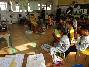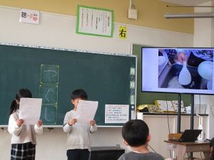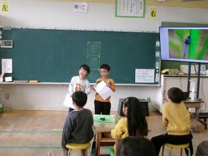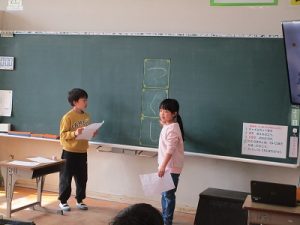 はじめに、1年間でどんな行事や学習があるのかを発表しました。 そのあと、1年生が“教科の先生”となり、幼稚園児にお勉強を教える時間をもちました。