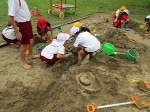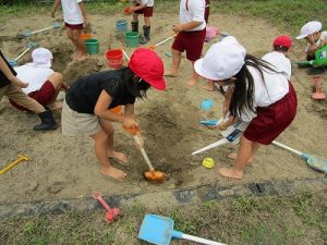 先週の生活科では、「カラフルいろみず」の活動を通して、色水を混ぜ合わせる楽しさを味わいました。「こんないろになった!」「次はこれとこれをためしてみよう!」と、 友だちと話し合いながら、発見を重ねていく姿が見られました。自分の思いを言葉にし、相手の考えにも耳を傾けることで、学びがより深まっていきました。そして今週は、みんなが楽しみにしていた「すな遊び」に取り組みました。生活科の時間に、校庭の砂場で思いきり活動しました。「すなが水を含むとおもくなっちゃう!」「川を作るには、早く掘らないと水がしみこんじゃう!」など、子どもたちは試行錯誤しながら、工夫を凝らして遊びを楽しんでいました。
